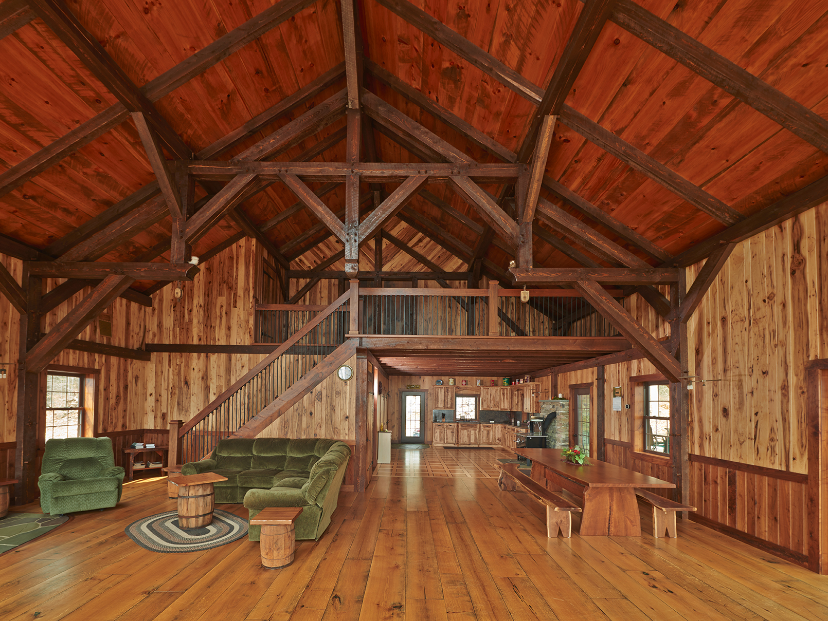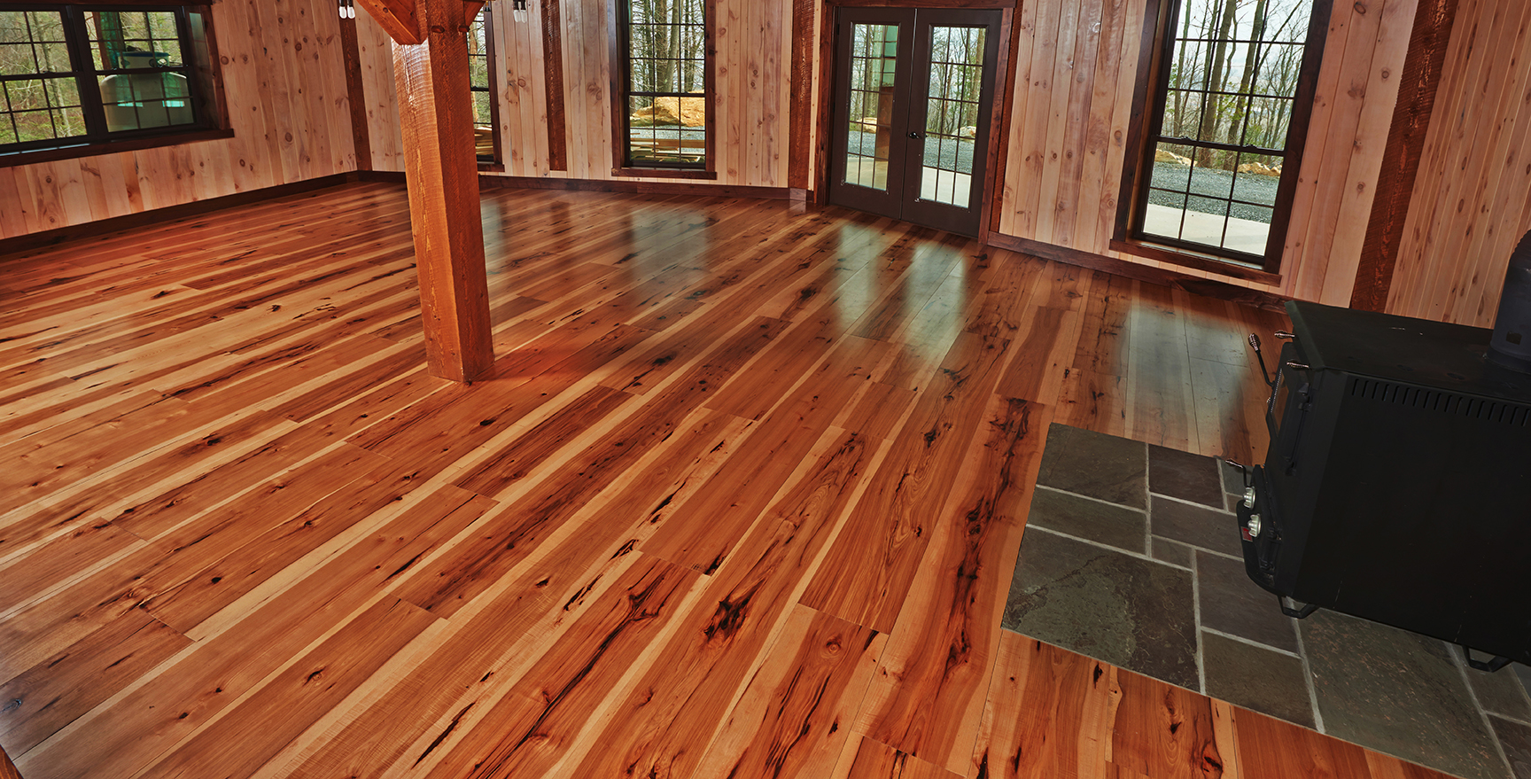 Nestled in the woods of Belleville, PA is this wonderful timber frame home featuring Amish built bridge trusses. The home features Live Sawn White Oak flooring on the main level, wide plank Cherry upstairs and natural character, engineered Hickory in the lower level.