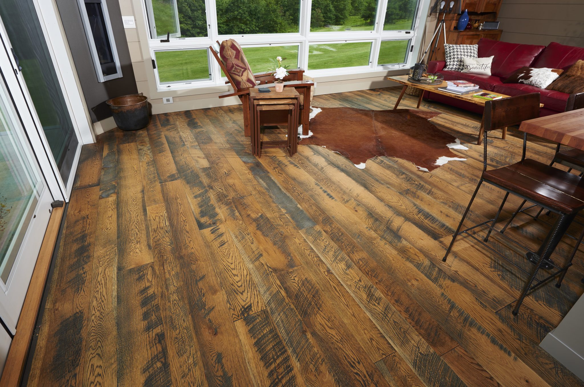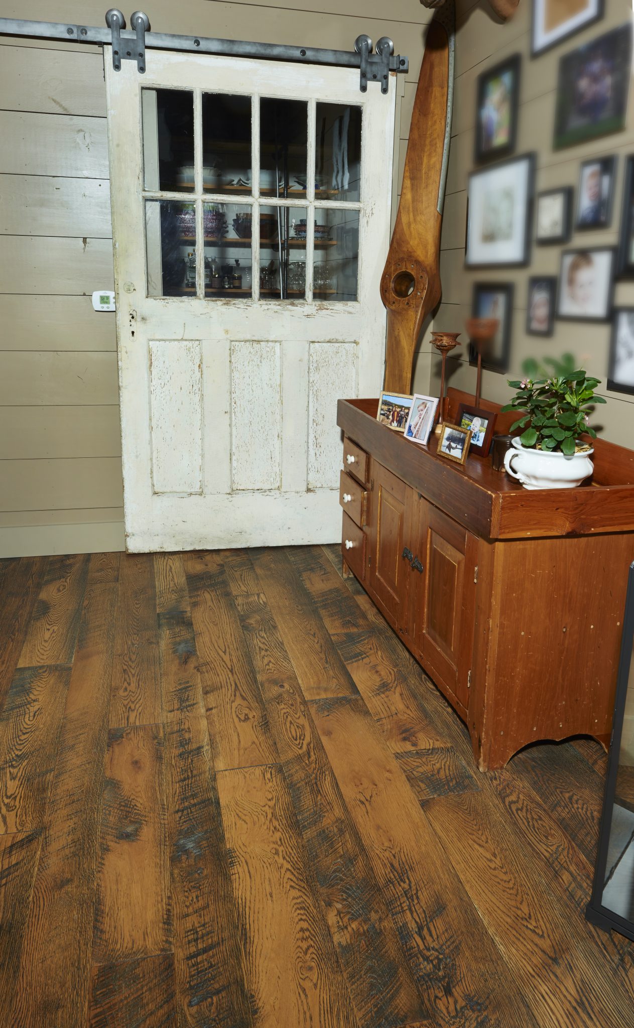 With an open floor plan, the comforting rich tones in the hardwood floors add a rustic flare to the decor from one room into another. The random widths along with floor-to-ceiling windows creates depth to each room providing a spacious feeling while enjoying the view.