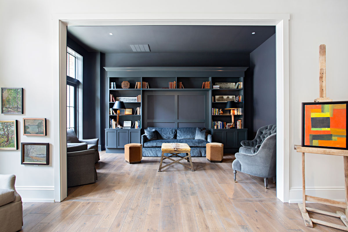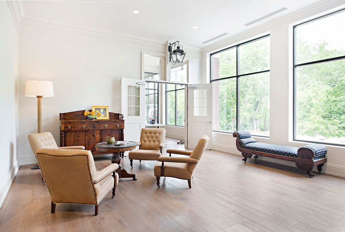 As you walk into the entrance you are welcomed with a warmth of natural colors while walking on our 5″ – 7″ – 11″ wide plank, Live Sawn White Oak hardwood flooring. Treated with a texture of light wire brushing, black bleed and a custom stain. We finished the floor with a matte finish that makes it look timeless and creates an inspiring design of the common space.
