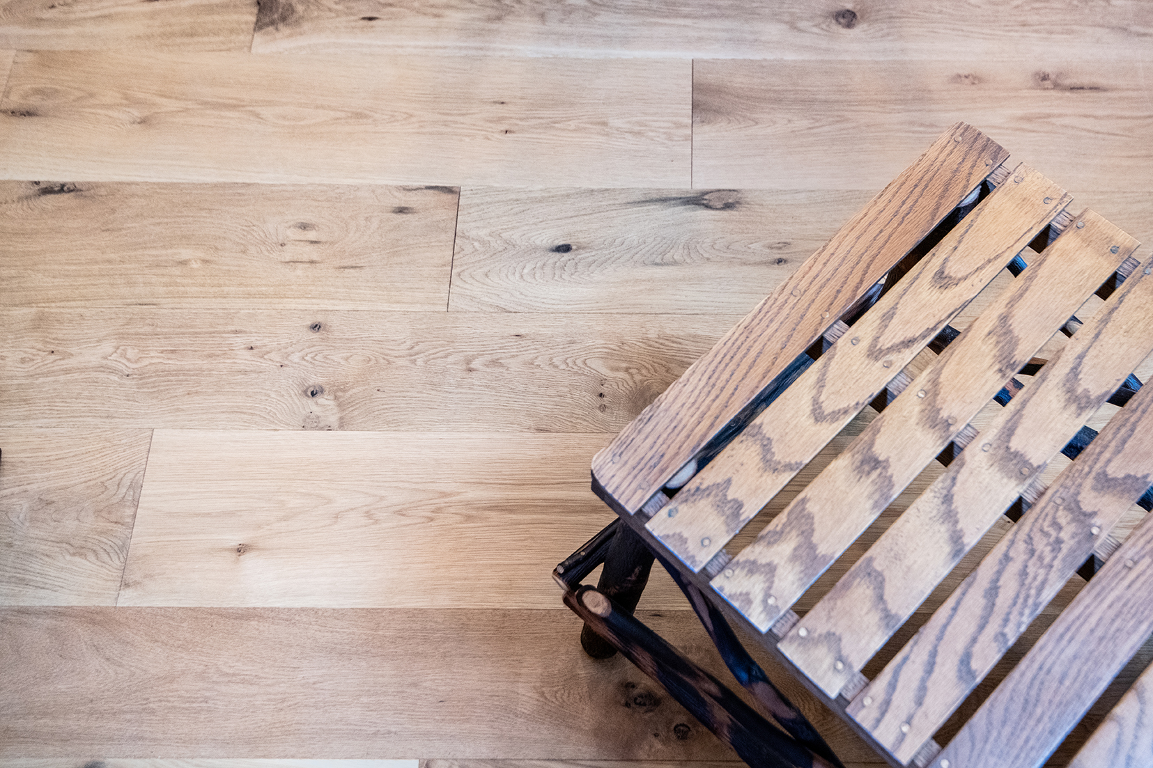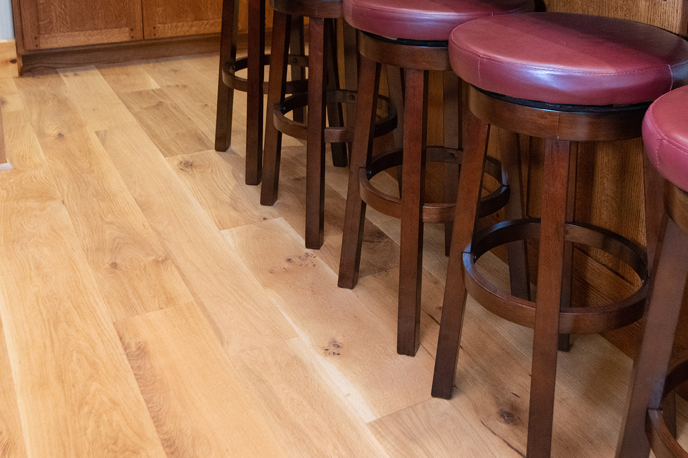 To continue the natural look, the homeowners selected random widths of 6, 7, 8 inch of natural character White Oak with knots filled and topped with a Rubio Monocoat Pure finish for their hardwood floors. The finish is an oil based natural product with 0% VOC (volatile organic compound). They were looking for something that was suitable to last many years and build stories of character for when the time came to pass down the house to future family generations.