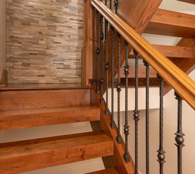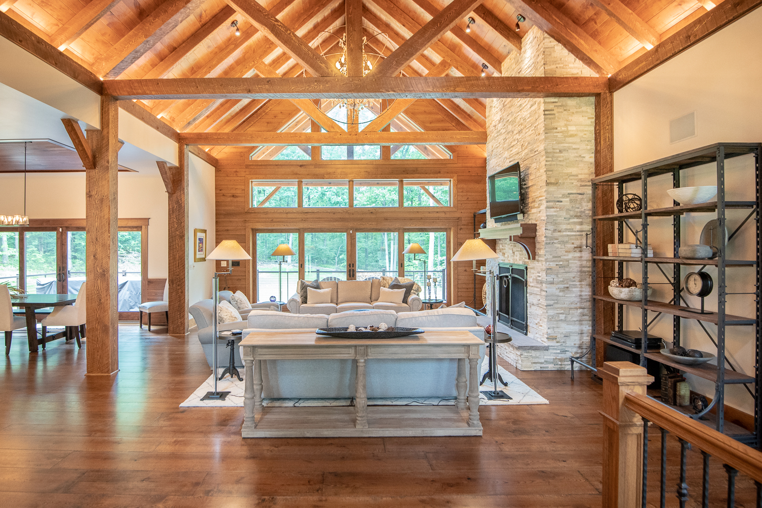 In Central Pennsylvania, an Amish crafted timber frame home is nestled into the woods just steps away from Rothrock State Forest on the hilltop of Seven Mountains. First step inside the door will take your breath away seeing a masterpiece of what skilled artisans can produce and craft into a beautiful home. Not only will you find real hardwood floors throughout the house but also the trim, moulding, paneling, beam wraps and stairs were all produced by our skilled craftsmen at Peachey Hardwood Flooring.