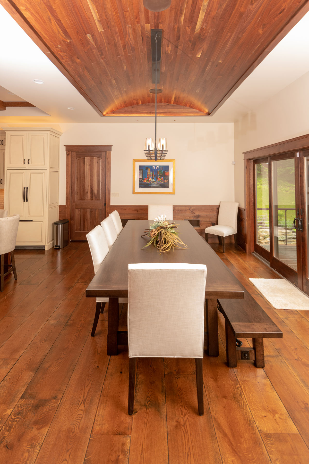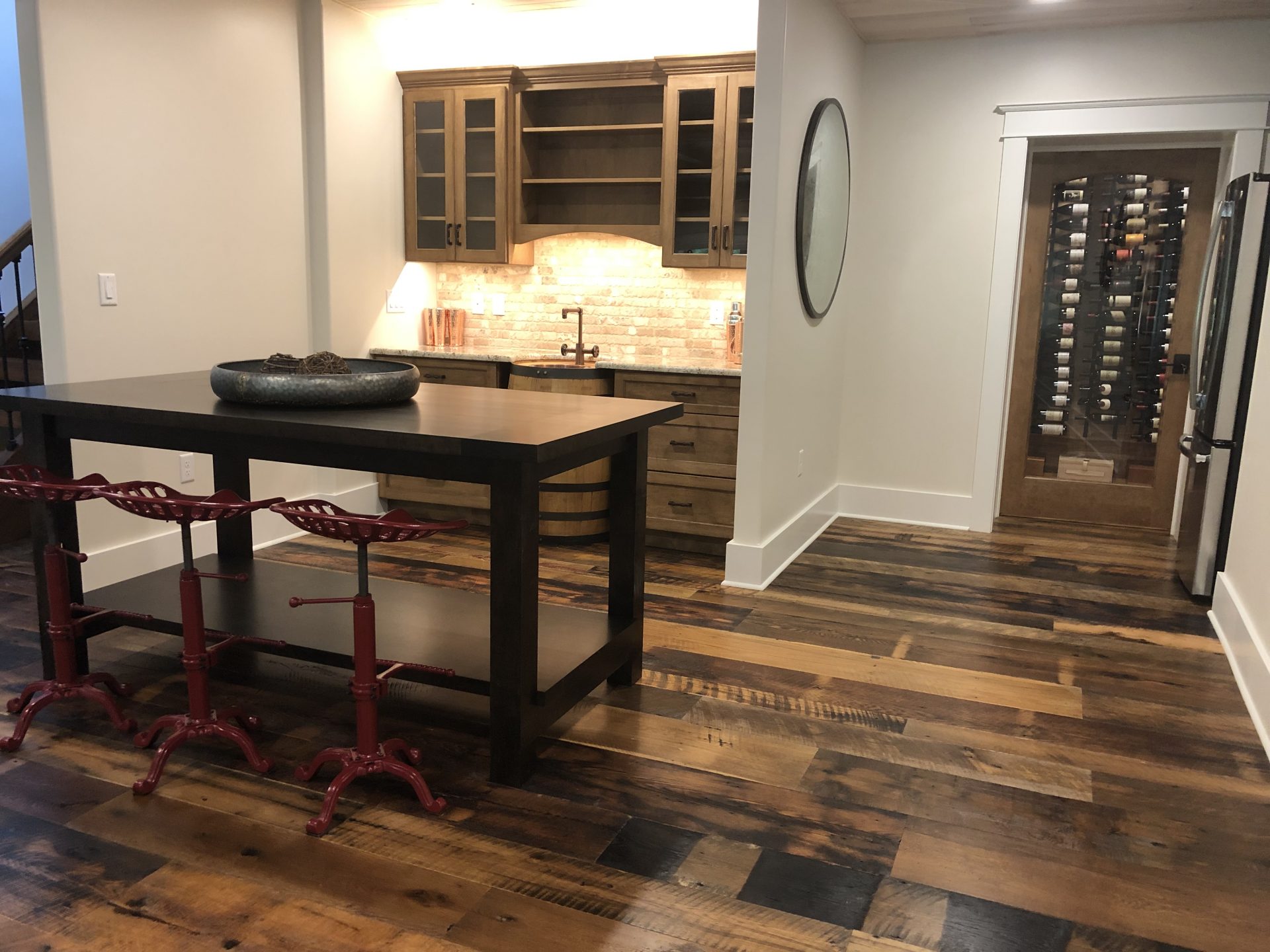 Each room has its own texture and tone of sophistication from the rustic hemlock beams to smooth cream cabinets. On the main level, you will see Live Sawn White Oak hardwood flooring that is textured with black bleed and finished with a Molasses stain. As you walk down the well-crafted floating wooden step staircase, you will encounter beautiful authentic Reclaimed Oak hardwood flooring. The wine cellar has impeccably detailed Red Birch herringbone flooring and shiplap paneling adding the perfect touch. Not to mention the master bedroom with stunning hand scraped Walnut floors and Walnut accent wall. Every detail was customized to the owner’s vision, which created perfect harmony throughout the home.