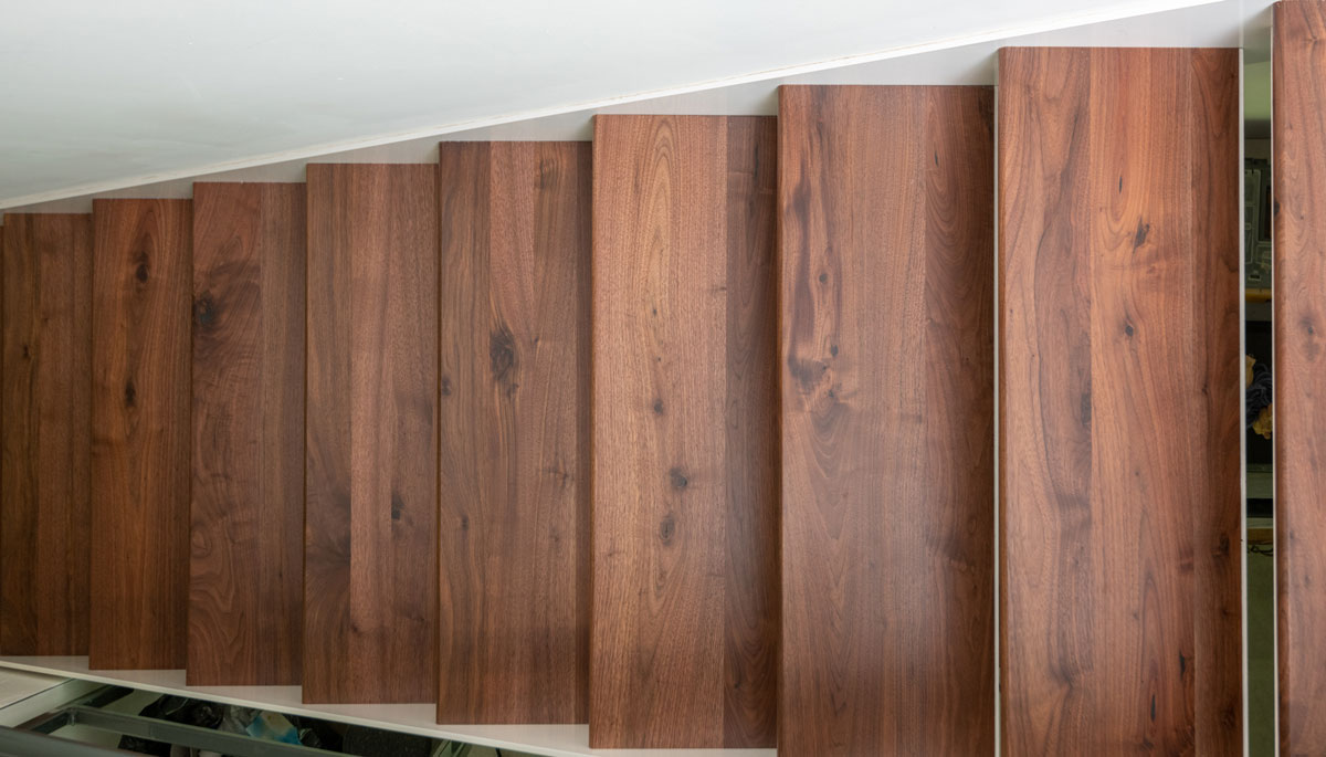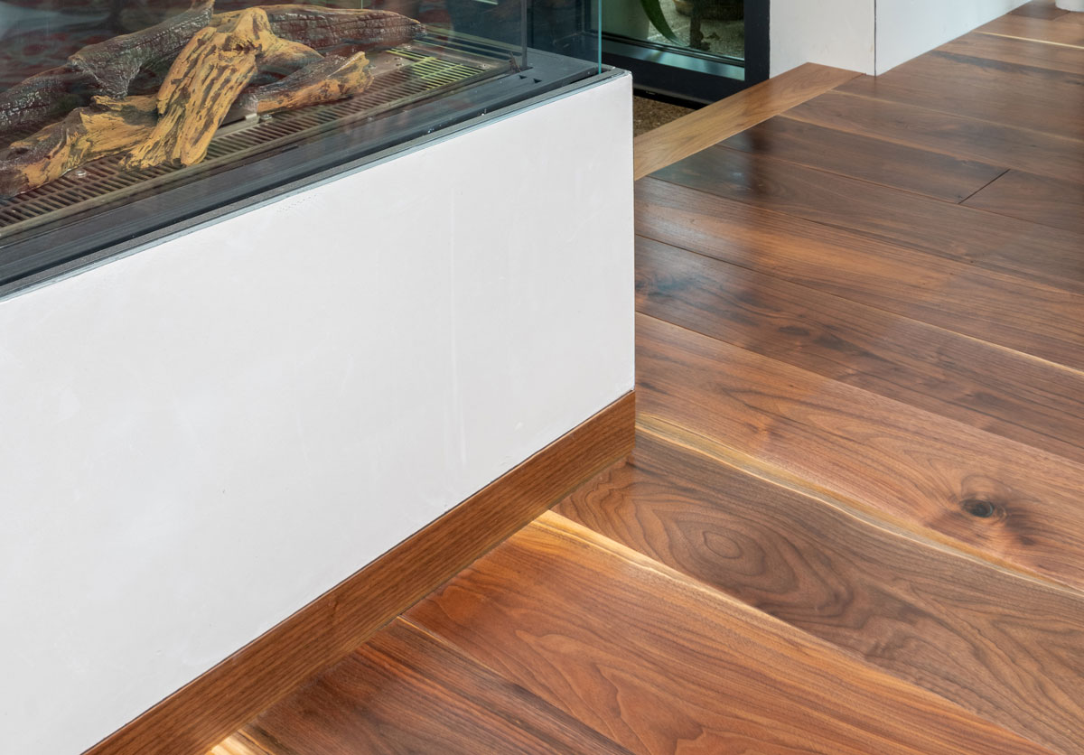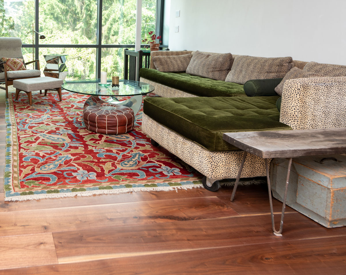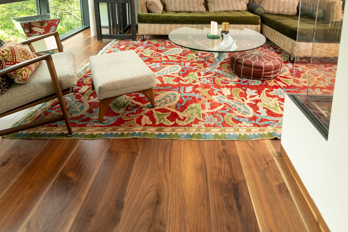 They were looking for new Walnut floors to match their current flooring in part home of their home. We created beautiful wide plank, 8 inch, natural Walnut hardwood flooring for them. We also created matching natural Walnut landing stair treads. These treads were crafted for their 1-ton steel staircase known as, “Elvis.”