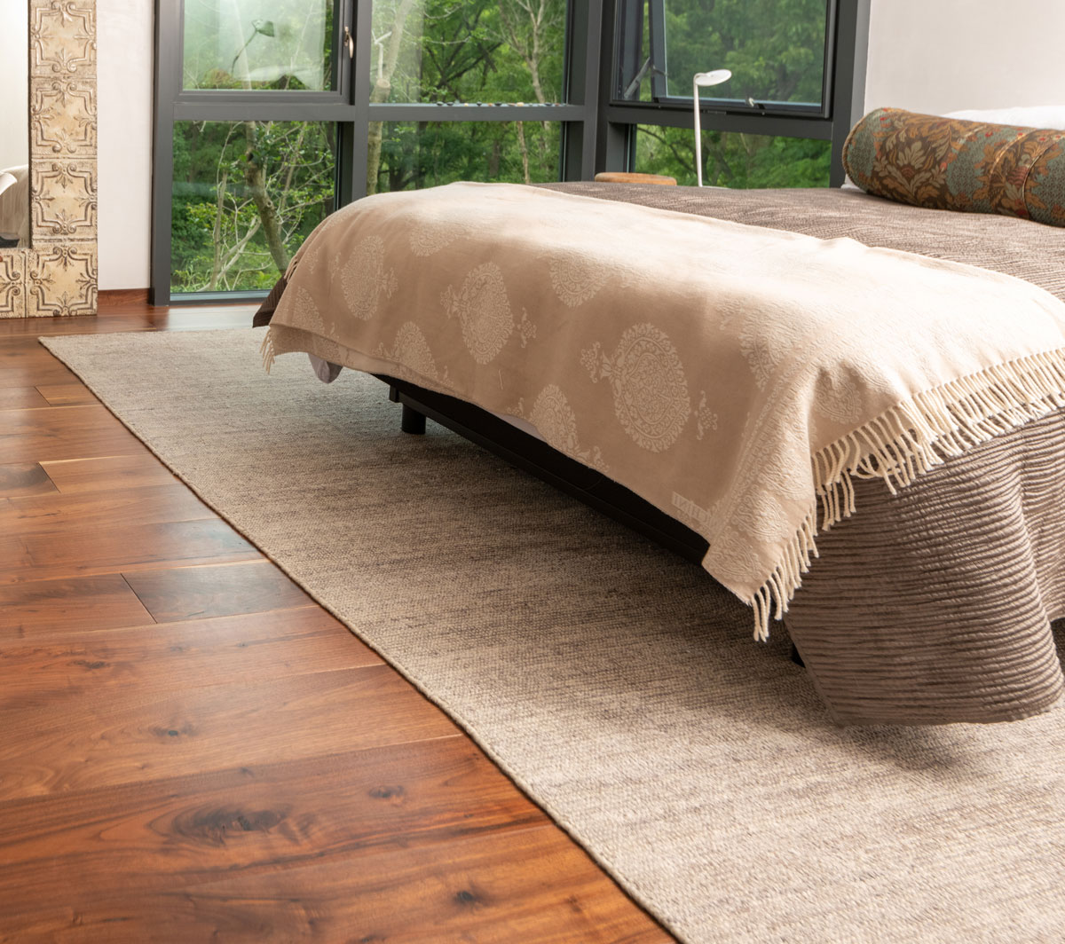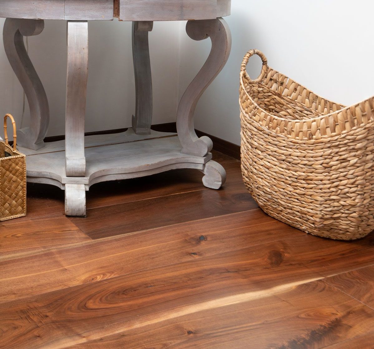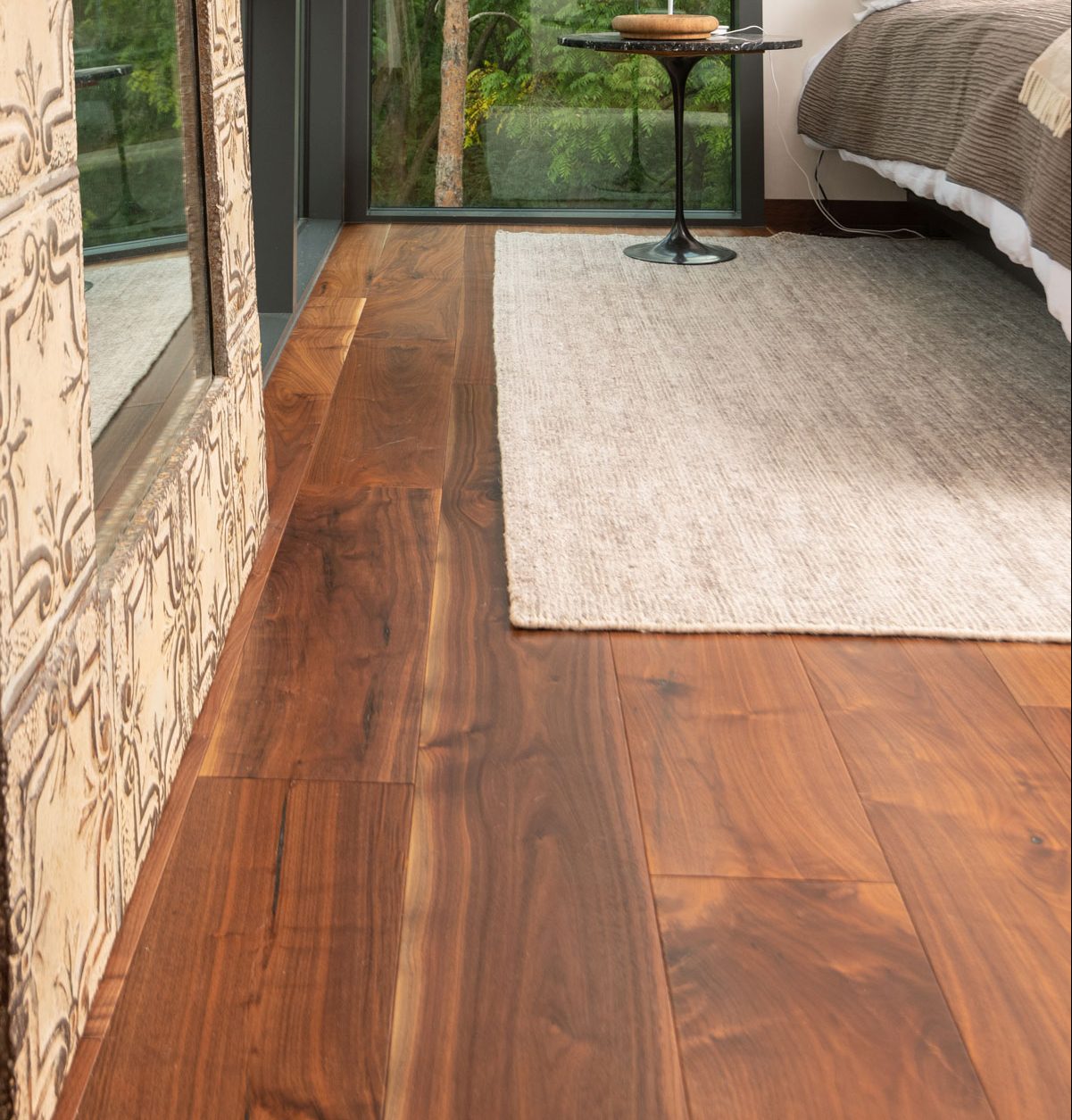 They were looking for new Walnut floors to match their current flooring in part home of their home. We created beautiful wide plank, 8 inch, natural Walnut hardwood flooring for them. We also created matching natural Walnut landing stair treads. These treads were crafted for their 1-ton steel staircase known as, “Elvis.”